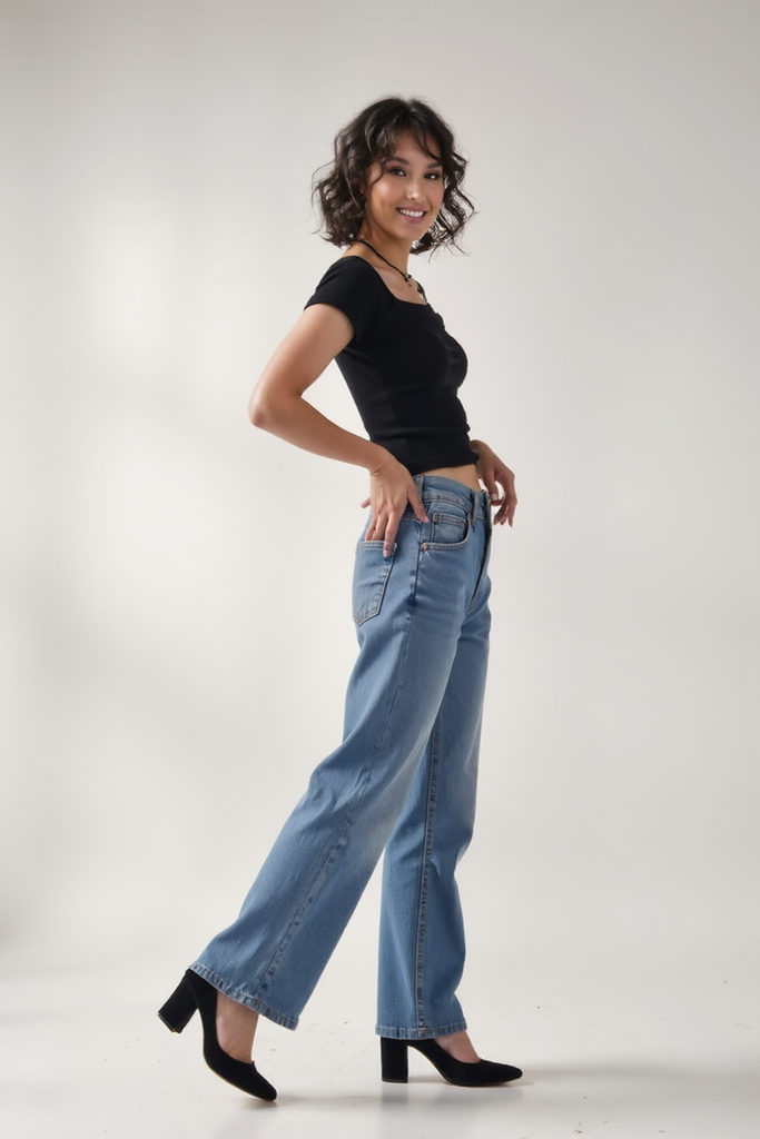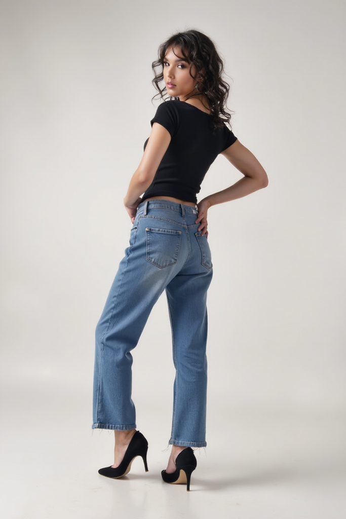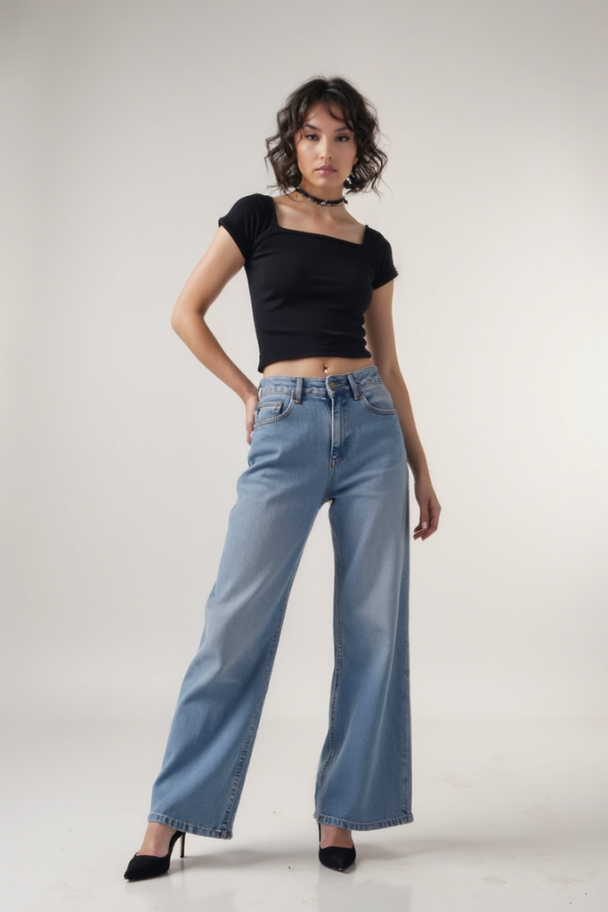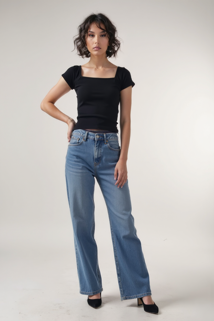 Featuring a sleek black square-neck crop top that hugs just right, and relaxed-fit blue barrel jeans for that laid-back, confident vibe — this outfit is a go-to for casual days, college hangouts, and Insta-worthy looks.
