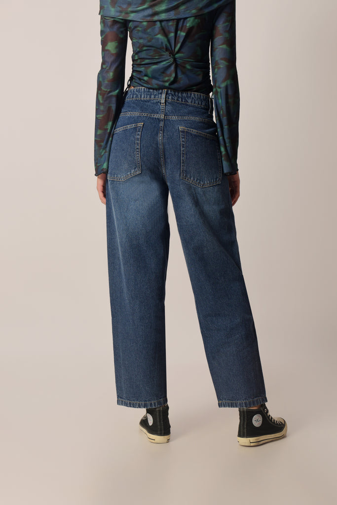 "Elevate your everyday style with these classic barrel jeans. Designed with a relaxed yet structured silhouette, these jeans feature a high-rise waist that cinches comfortably for a flattering fit. The tapered leg adds modern shape while offering a roomy, curved fit through the thighs and hips — true to the barrel style.