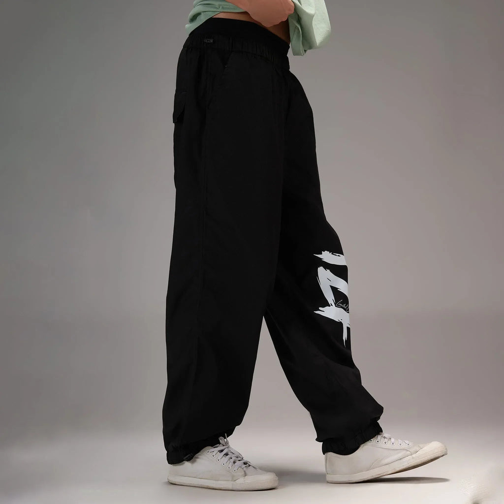 Stand out, stay bold. These limited-edition black parachute pants feature a fierce graphic print on one leg and a silhouette that screams confidence. The roomy fit and gathered hems give you the freedom to move, lounge, or turn heads. Dress up or down with a shirt or a graphic tees