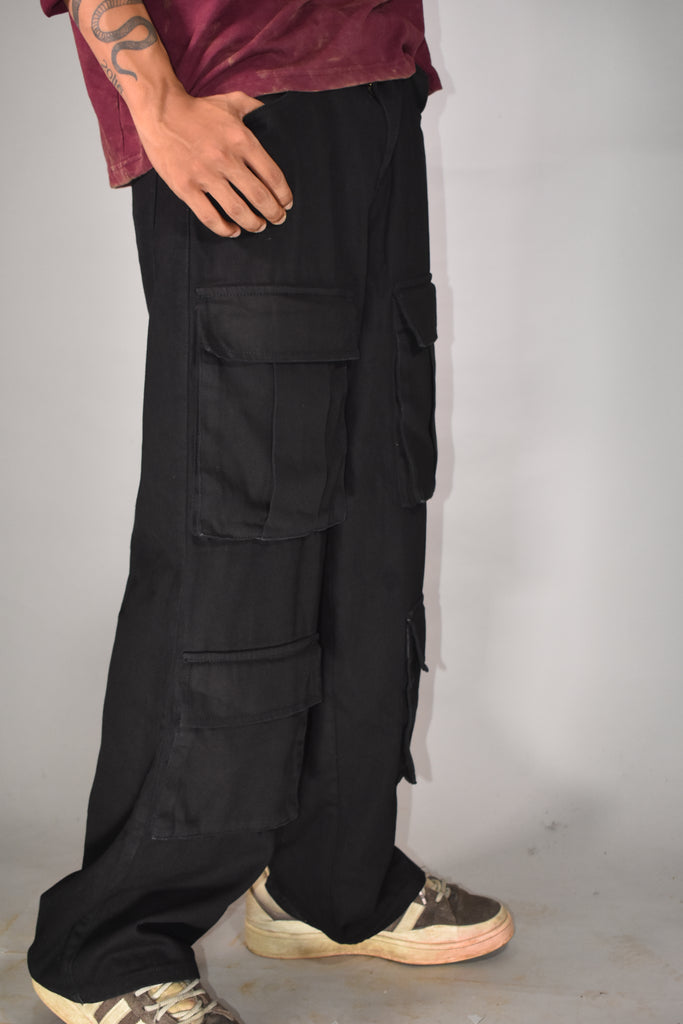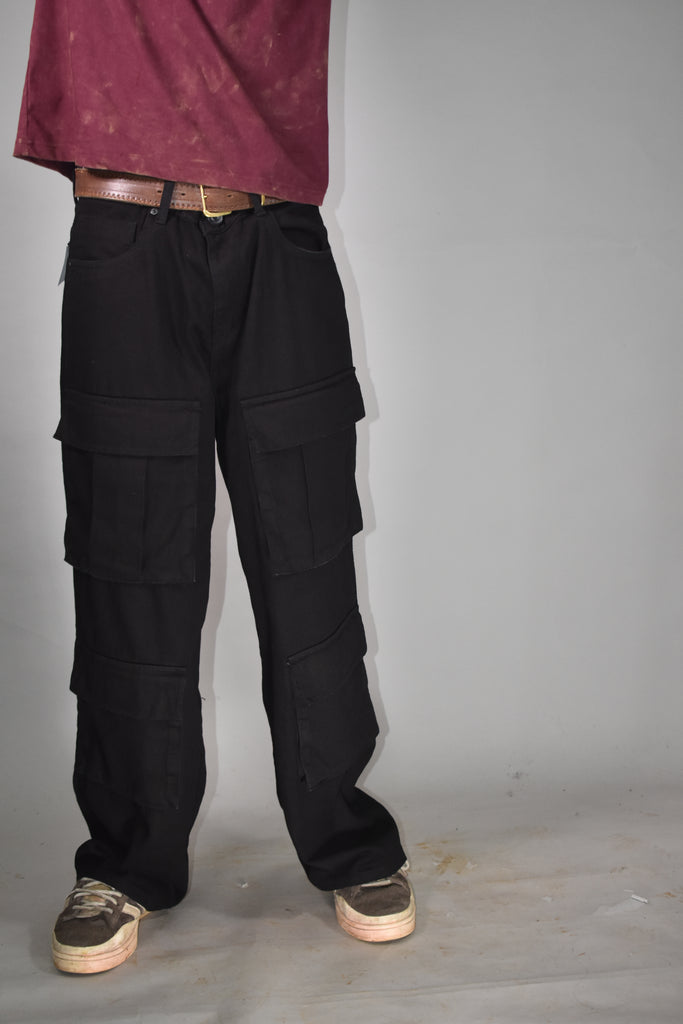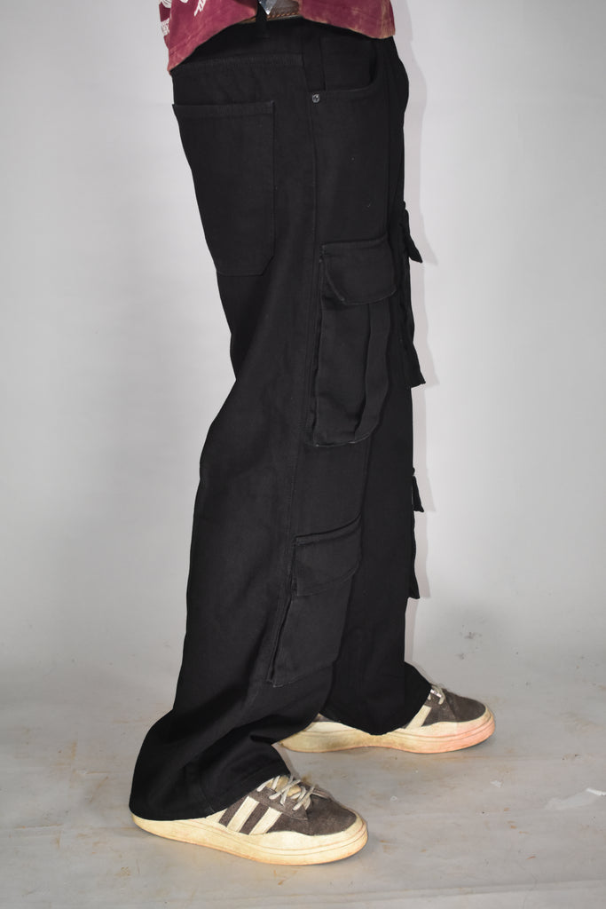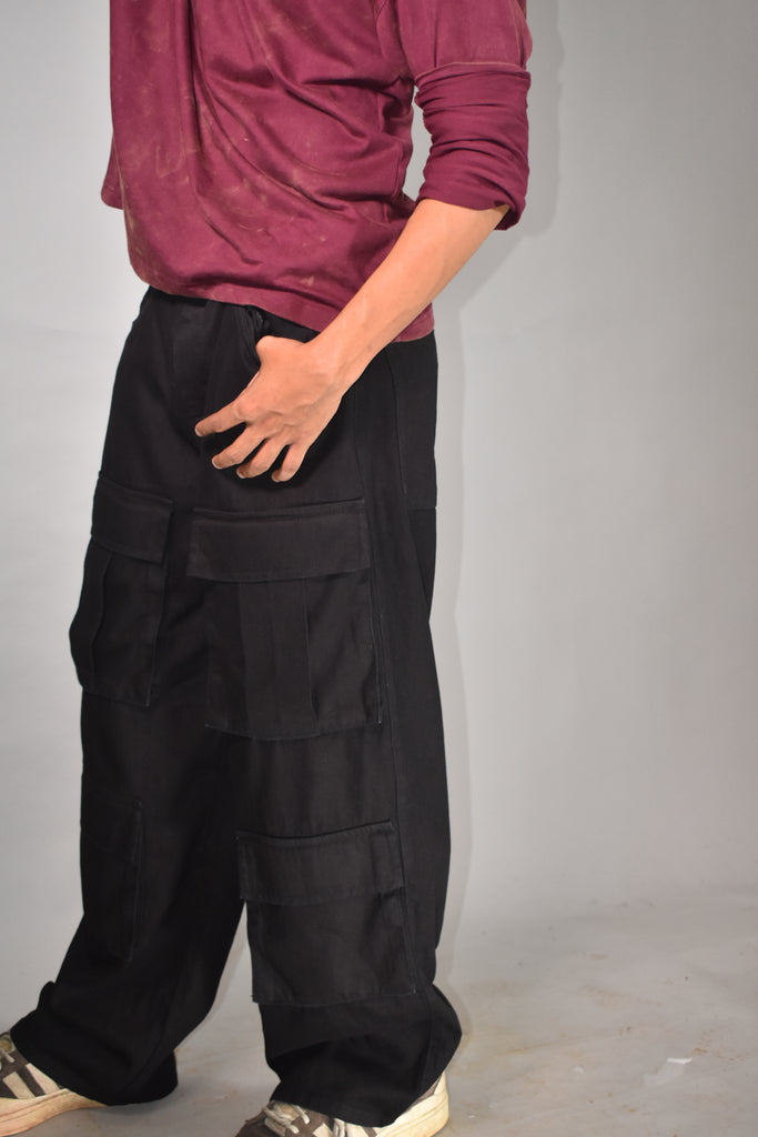Utility meets edge with these Black Multi-Pocket Cargo Pants for men, designed for all-day function and effortless style. The straight-leg silhouette is balanced with multiple oversized flap pockets along the thighs and knees, adding both practicality and a rugged streetwear aesthetic. A versatile black wash ensures easy pairing with anything in your wardrobe.