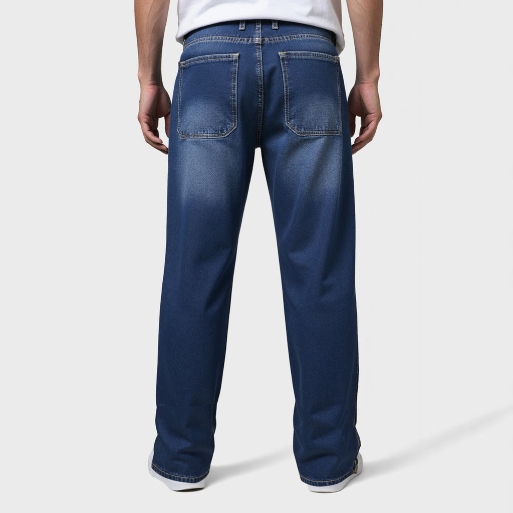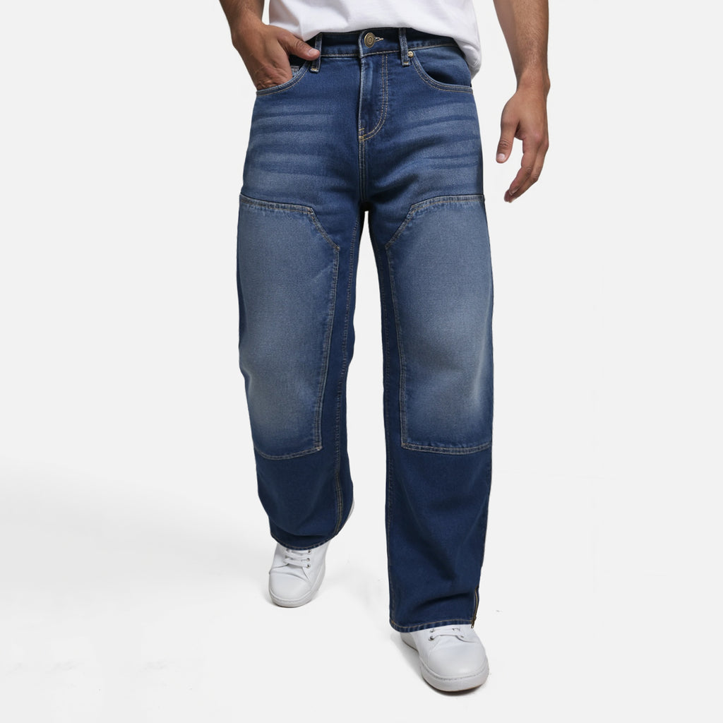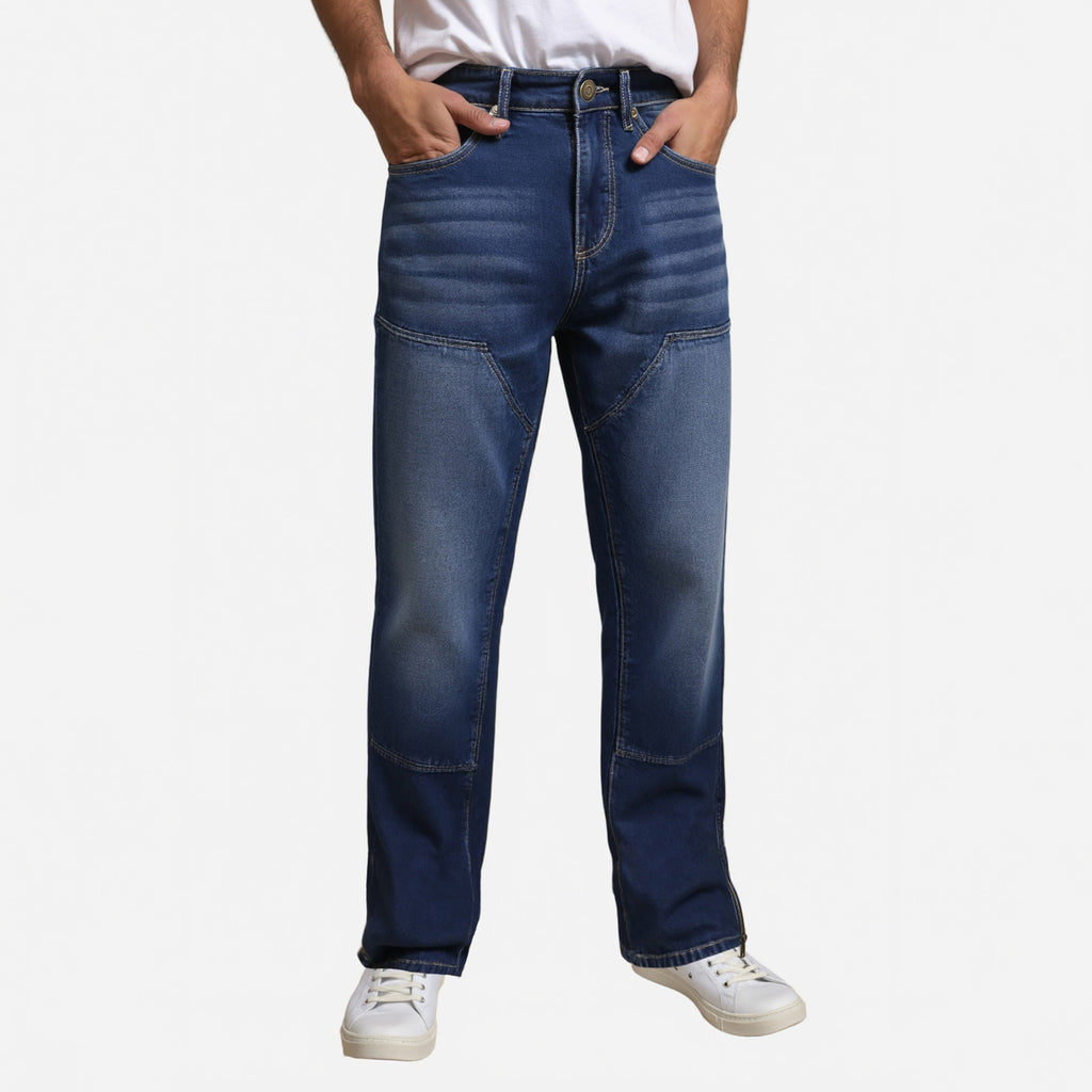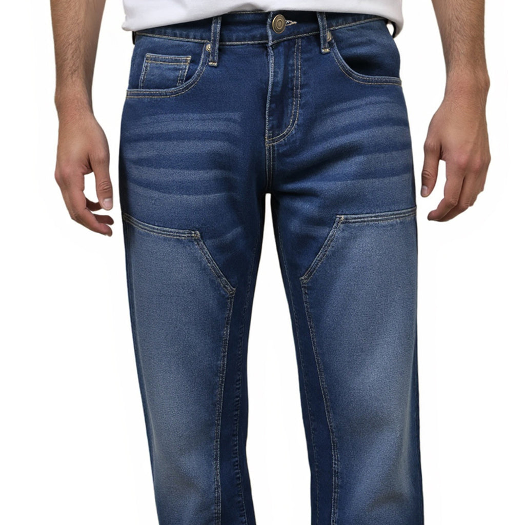 Bring a bold, structured edge to your denim collection with the Contrast Stitch Patch Denims for men. Designed in a straight fit, this style stands out with oversized stitched patch panels across the thighs and knees, adding a modern utility-inspired detail. The mid-blue wash gives it a timeless denim look, while the reinforced seams elevate both durability and style.