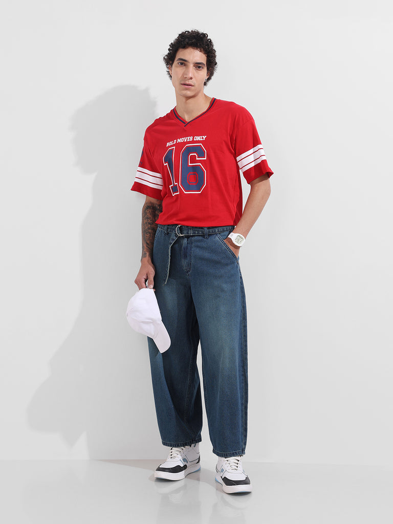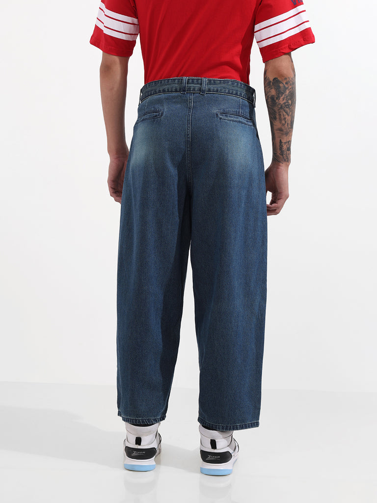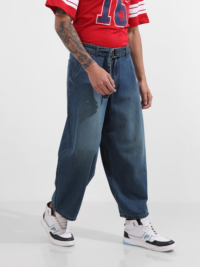 Upgrade your denim game with these barrel baggy fit jeans for men, designed with a relaxed, roomy silhouette that tapers subtly at the ankle. Crafted in a mid-blue wash with soft front fades and highlight whiskers, they bring a casual yet elevated streetwear vibe. Finished with a D-ring belt detail for added edge, these jeans combine comfort, style, and utility in one effortless piece.