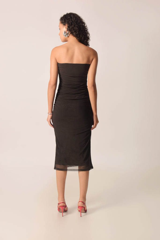 Designed to accentuate your curves with a flawless fit. Crafted in classic black, this dress features elegant ruched detailing throughout, enhancing your silhouette while offering a flattering, body-hugging look. The strapless tube neckline adds a touch of sophistication, making it perfect for both day-to-night transitions. Whether you're heading to a night out or a special event, this midi-length stunner is your go-to for effortless glamour. Dress it up or dress it down by throwing a jacket on.