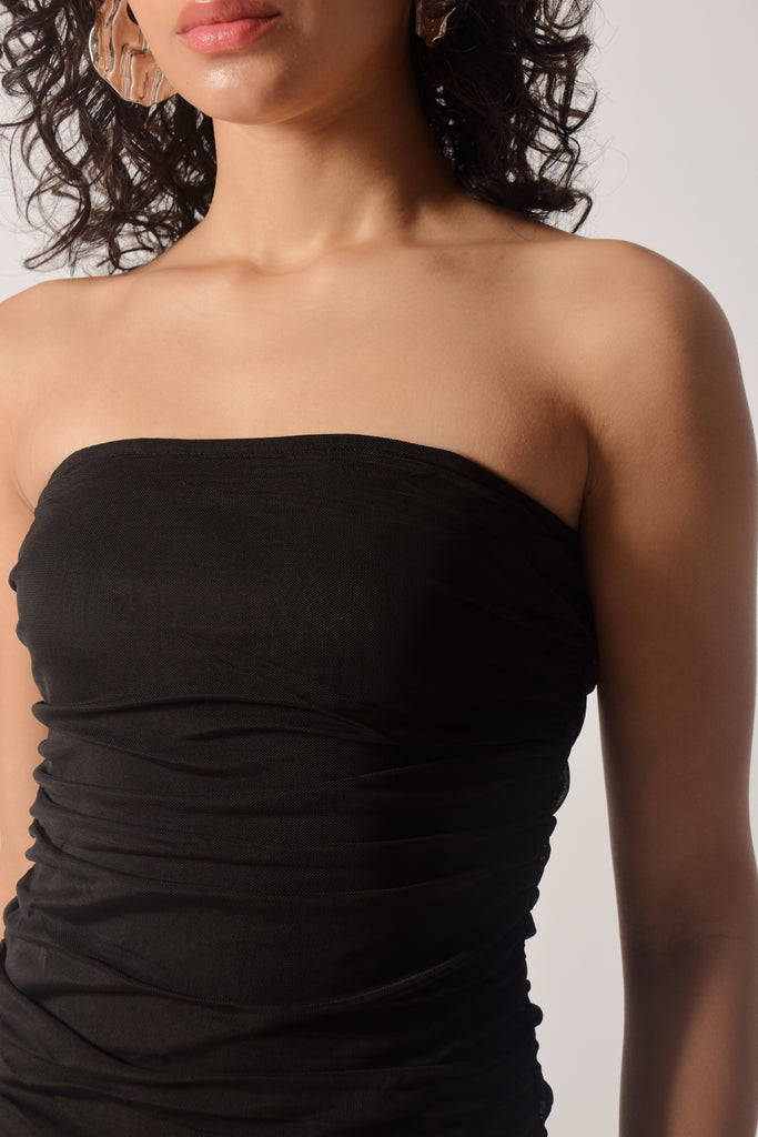 Style this mesh ruched tube dress with statement heels — strappy stilettos or metallic pumps. Add a bold clutch, gold hoops or danglers, and a sleek watch or bracelet stack. For makeup, go with a classic red lip or