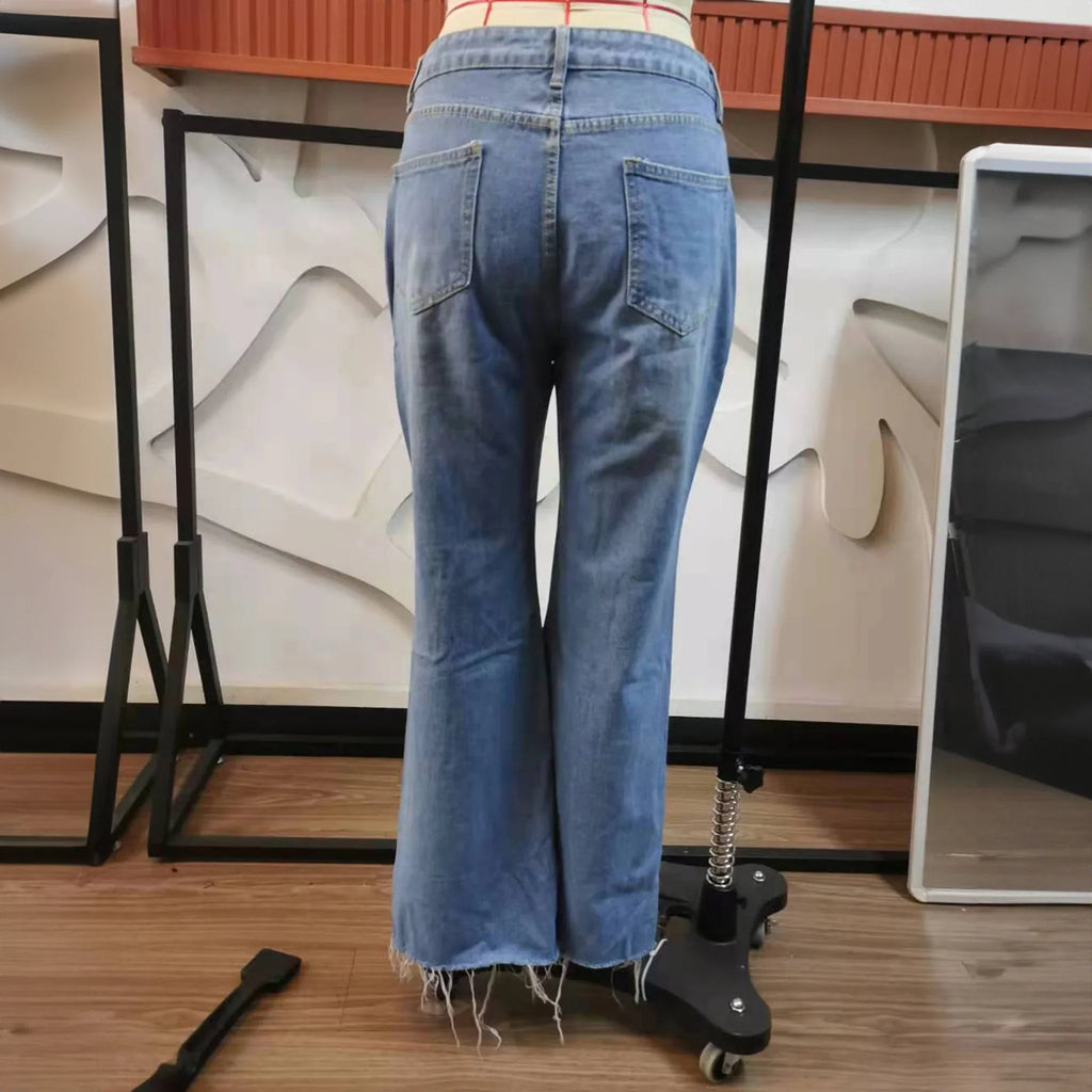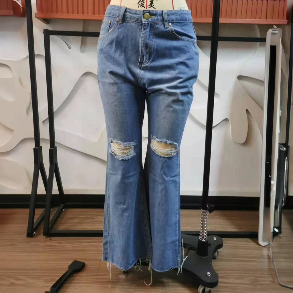High-waist, torn & distressed denims. Bootleg. Made of soft cotton. Perfect pair to flaunt the 80's look. Button waist opening with zipper. Fits snug till the knee and below that flares up .
