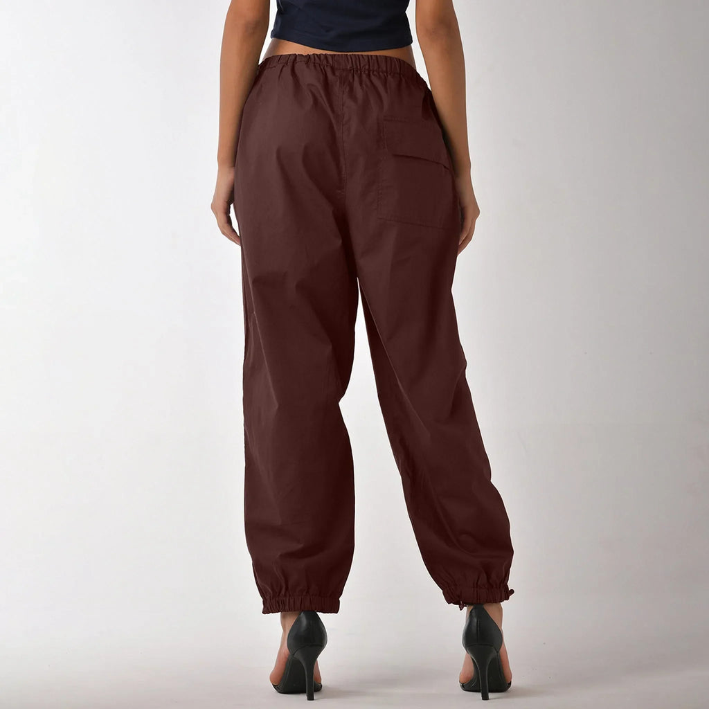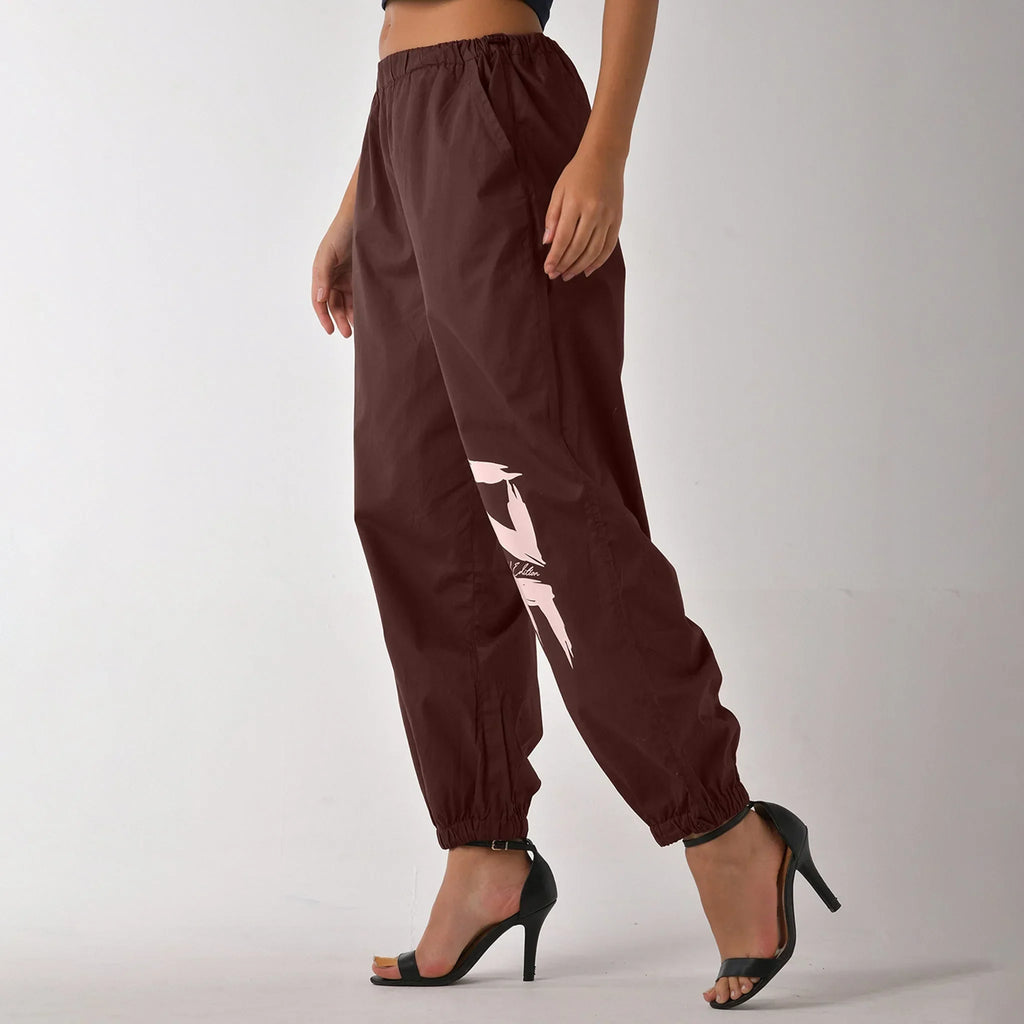 Stand out, stay bold. These limited-edition brown parachute pants feature a fierce graphic print on one leg and a silhouette that screams cool-girl confidence. The roomy fit and gathered hems give you the freedom to move, lounge, or turn heads.