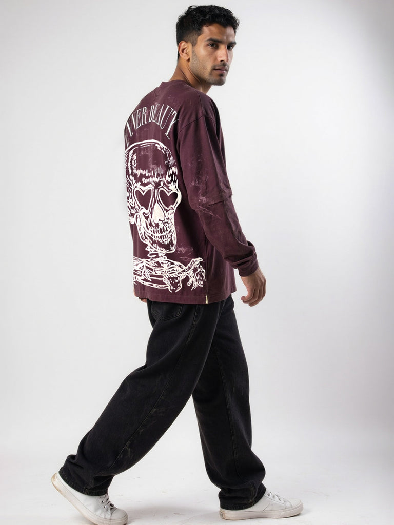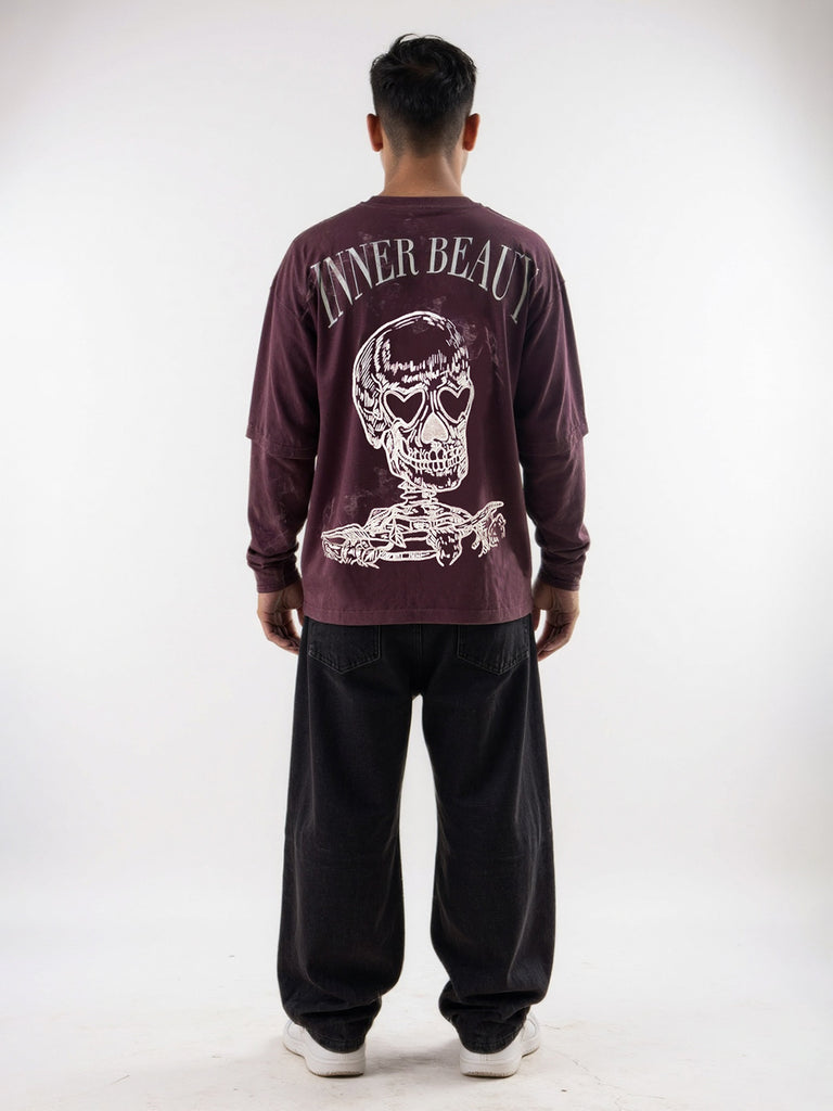 The Graphic Oversized Boxy Long Sleeve Tee blends bold streetwear energy with a relaxed, lived-in vibe. Featuring a statement back print of a skull thats says “Inner Beauty,” this tee stands out as an edgy piece for those who like making a visual impact. The acid wash adds a vintage-inspired finish, giving it that worn-in street look. .Oversized boxy fit with dropped shoulders