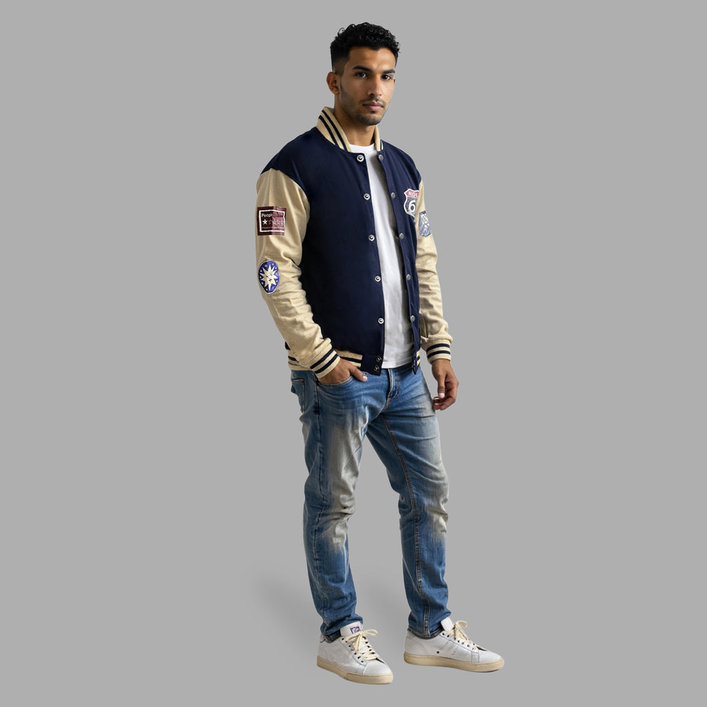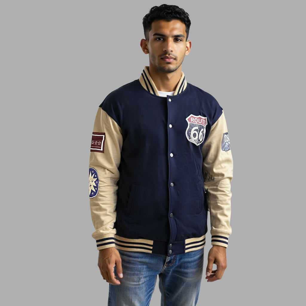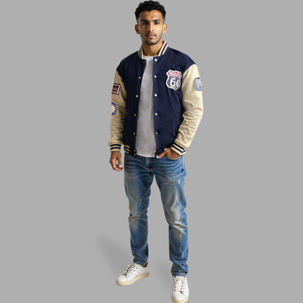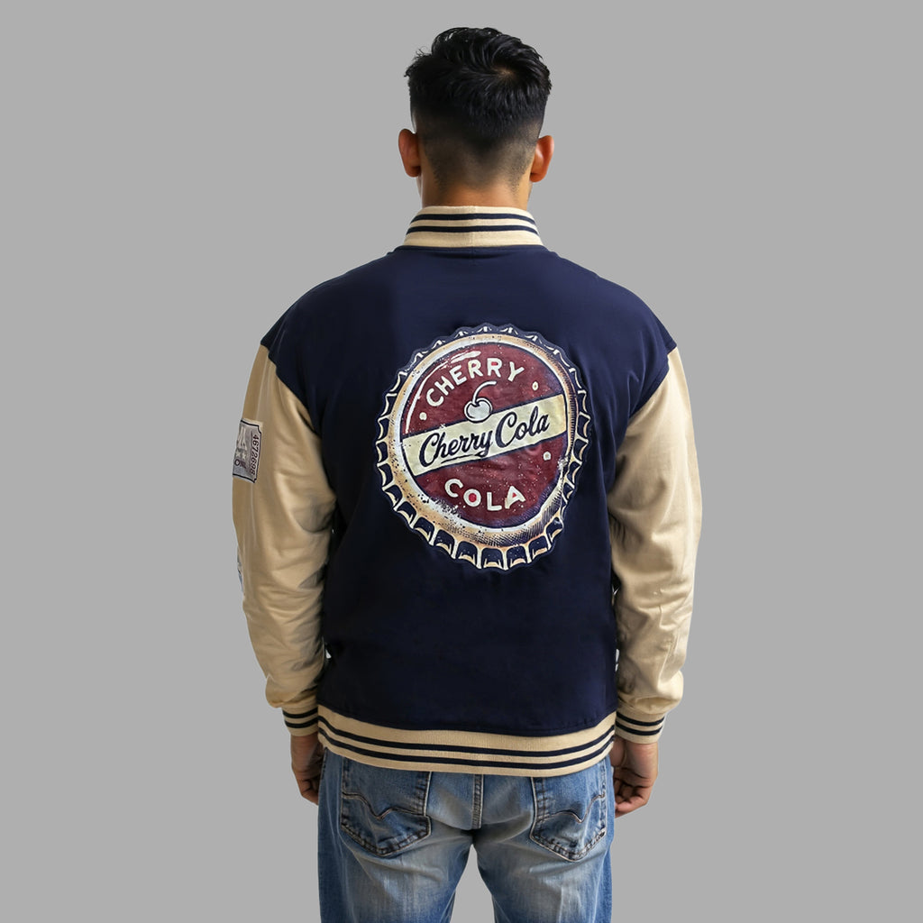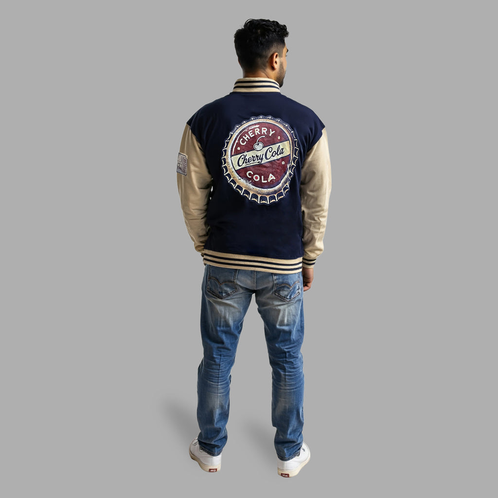Step into vintage Americana with this retro-inspired varsity jacket, blending classic sportswear with bold graphic patches. Featuring a striking navy and beige color block, the jacket is decorated with iconic details: a Route 66 shield patch on the front, cinema and star patches on the sleeves, and a standout Cherry Cola bottle-cap graphic across the back for a nostalgic punch. Striped ribbed trims on the collar, cuffs, and hem complete the authentic varsity look.