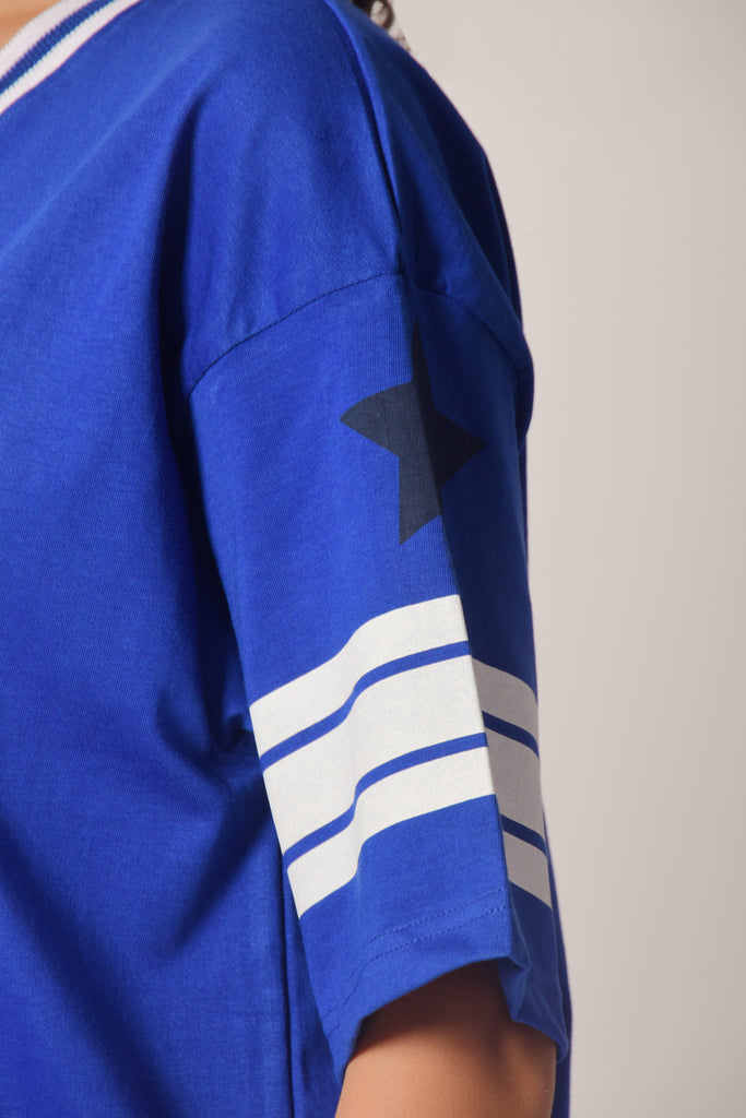 Make a statement in laid-back style with our Blue Oversized Varsity T-Shirt.