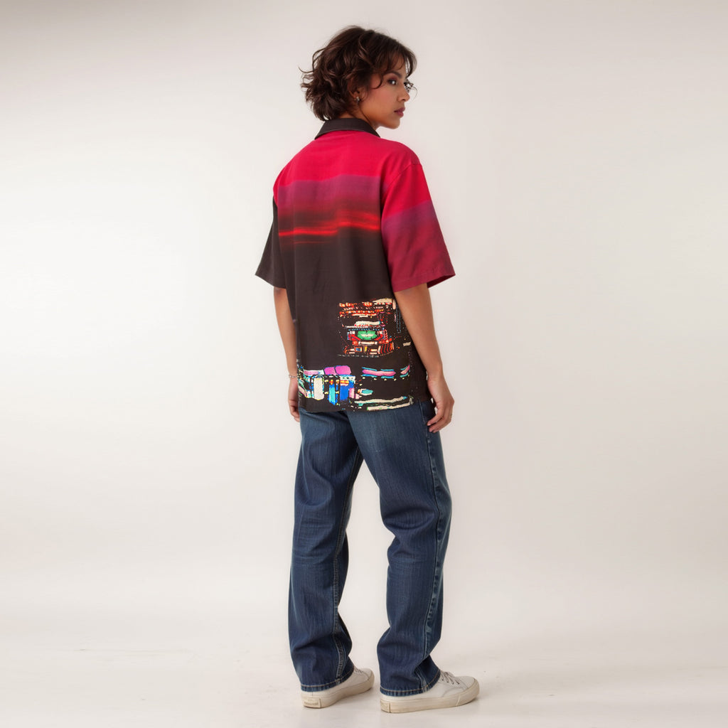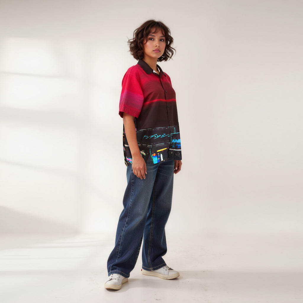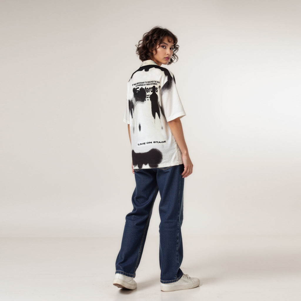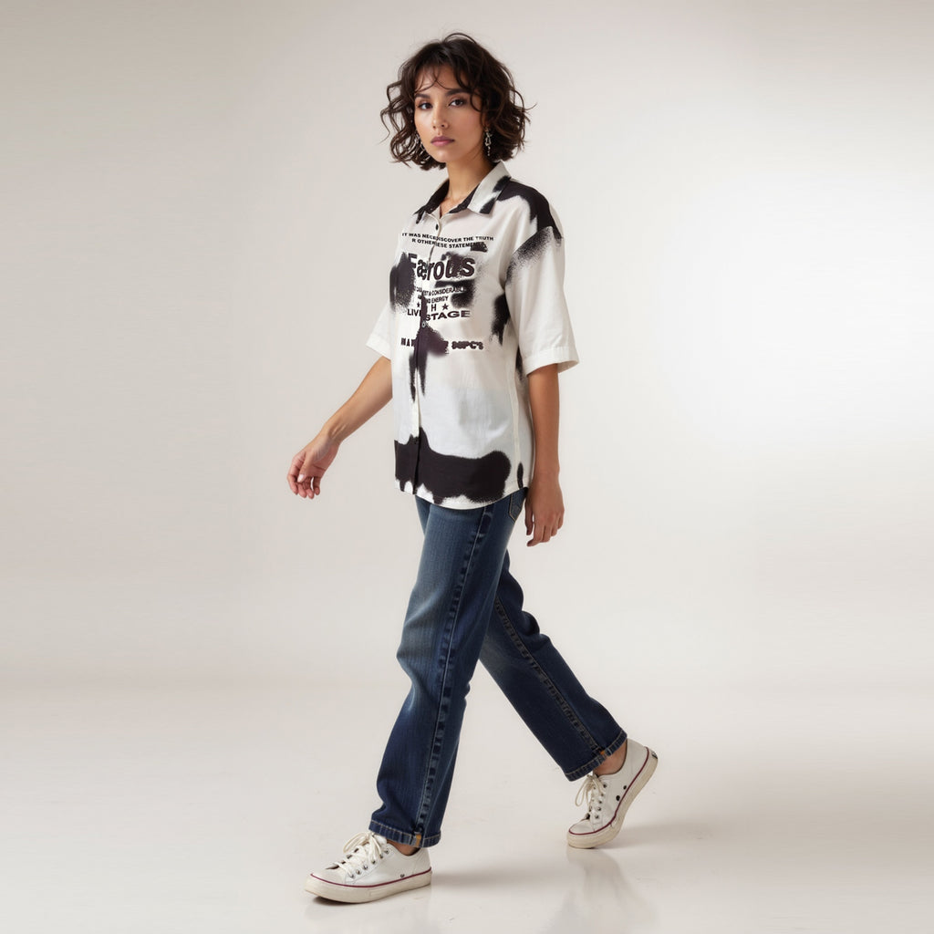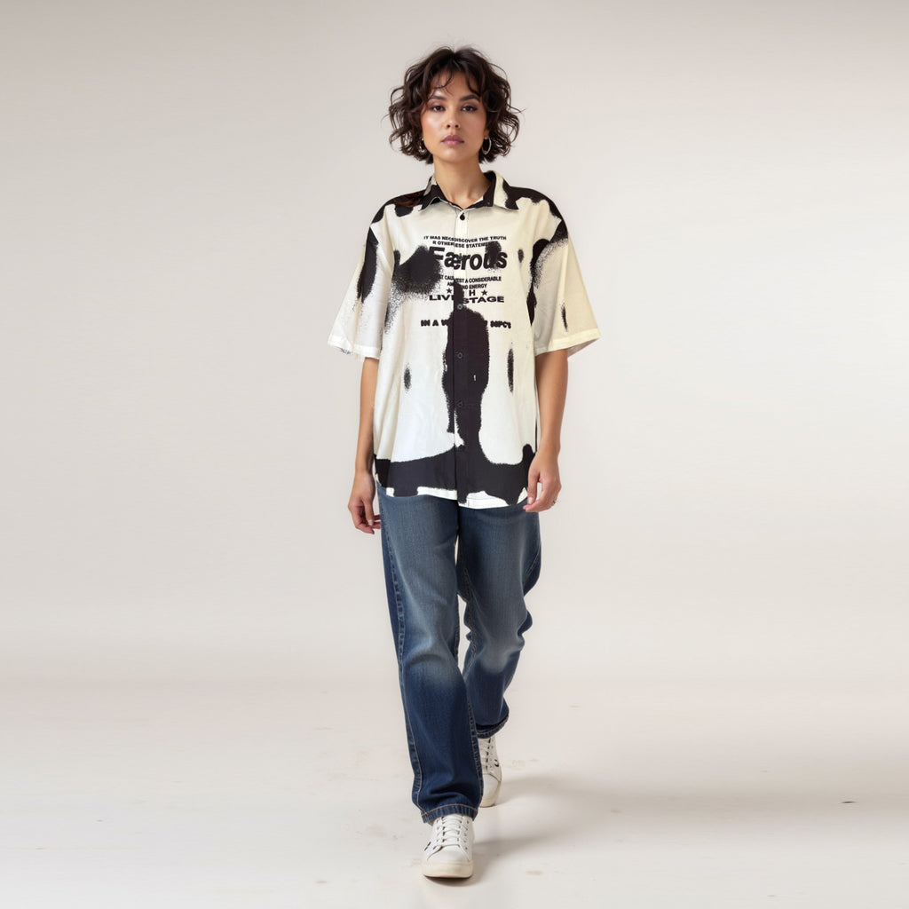 Not your average button-down. This black and white printed shirt is all about chaos, contrast, and confidence. With abstract splashes and bold text placement, it’s made for after-dark scenes, dancefloors, and nights that never end.