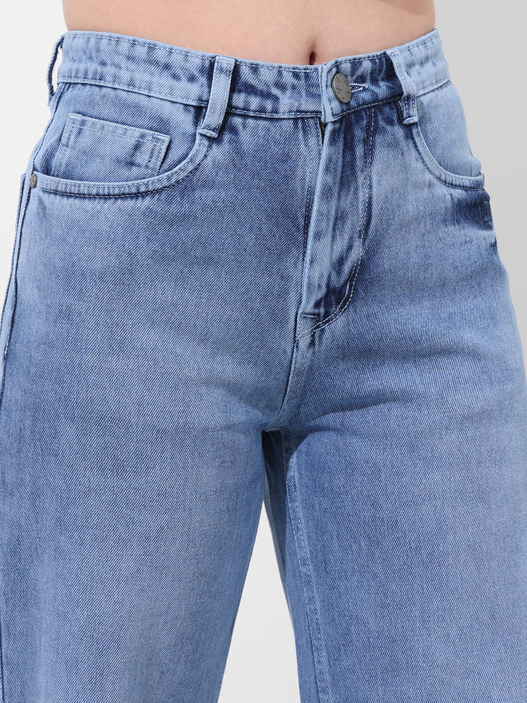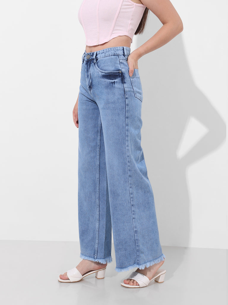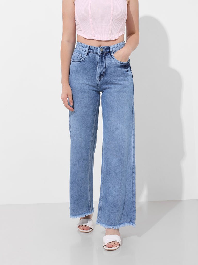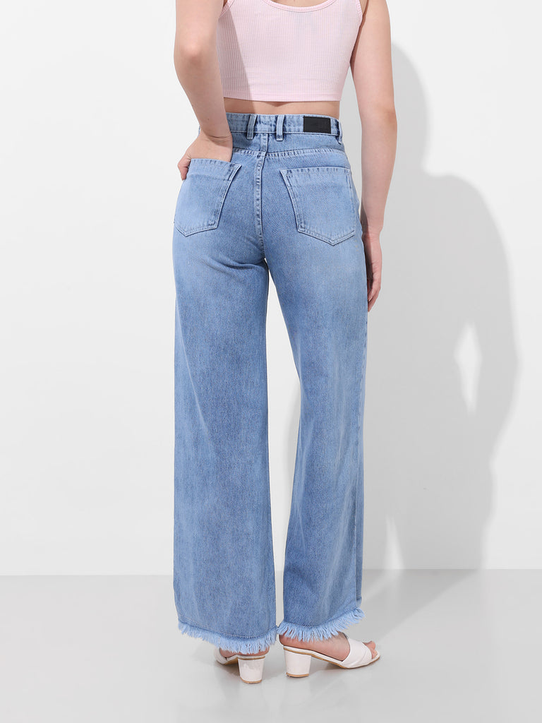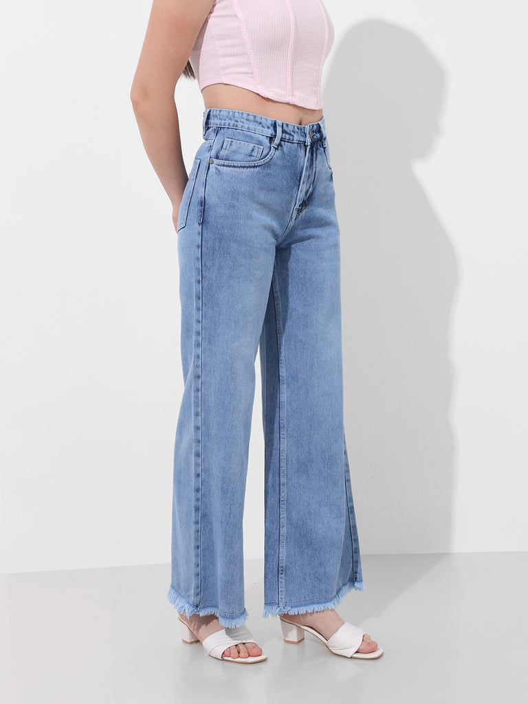 The Wide Leg flared Denim for women is designed for a modern streetwear-meets-chic look. Featuring a wide, straight flow from hip to hem, it emphasizes a relaxed yet structured silhouette. The mid-light blue wash keeps it versatile, while the raw frayed hem adds a touch of edge, making it perfect for both casual and styled-up outfits.