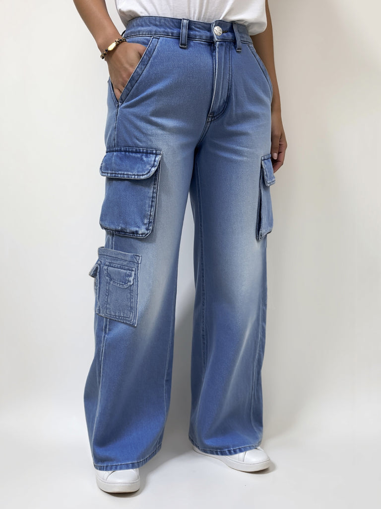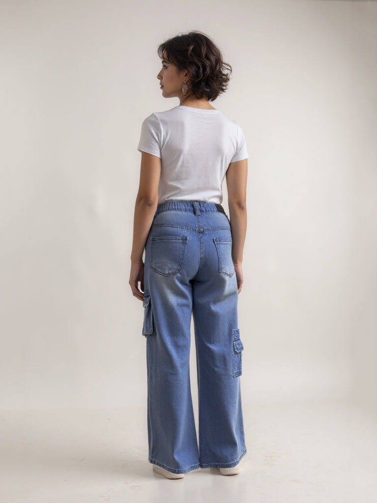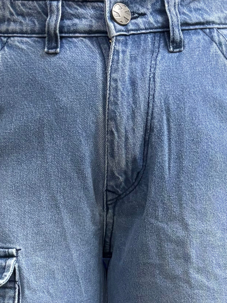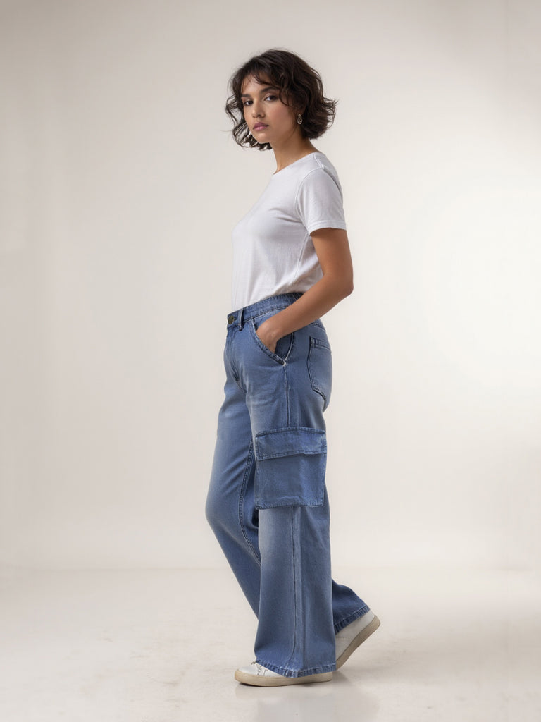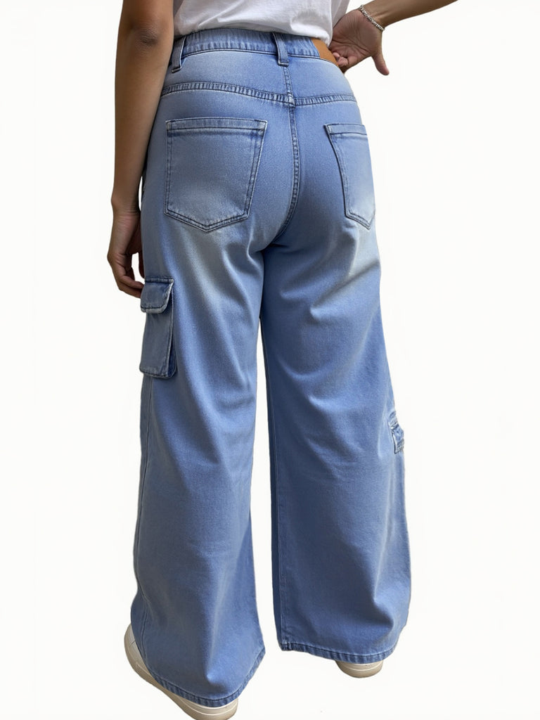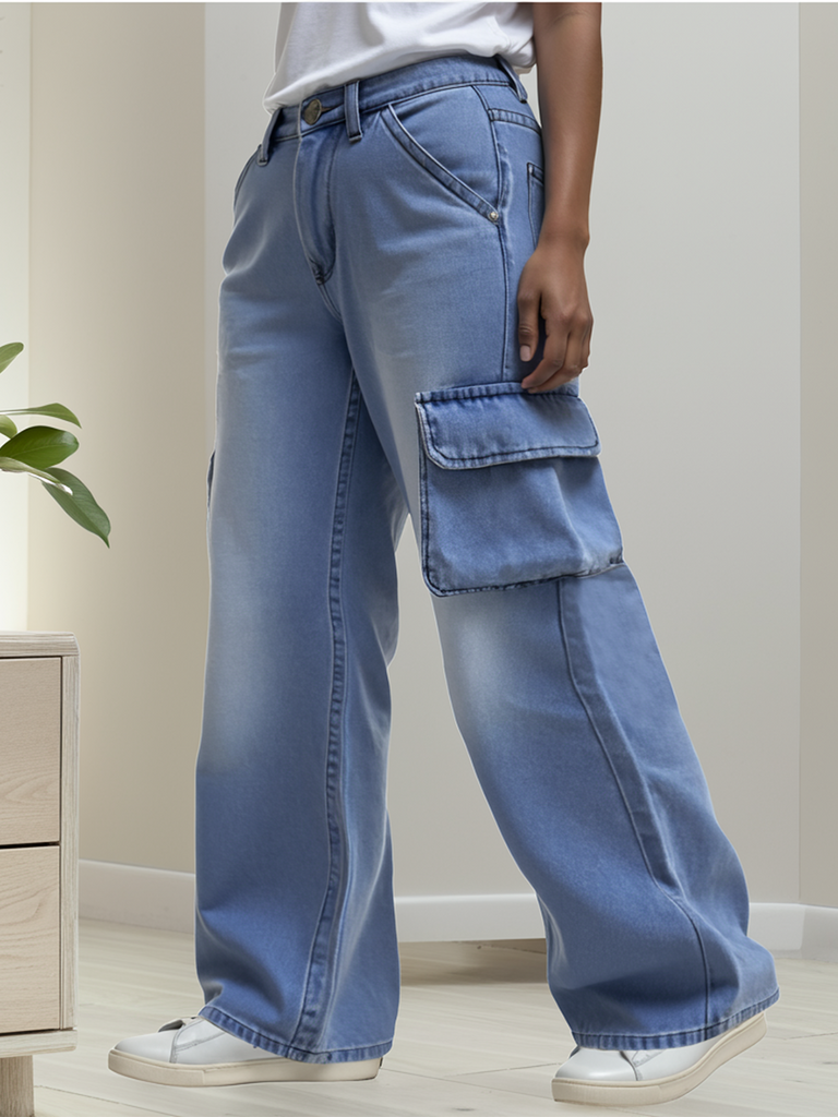 The Wide Leg Cargo Denim for women blends oversized streetwear energy with practical utility details. Designed with a relaxed wide-leg fit, it features multiple flap cargo pockets along the thighs for both function and style. The light blue stone wash adds a faded, vintage-inspired look that makes it perfect for casual everyday wear or standout street fits.
